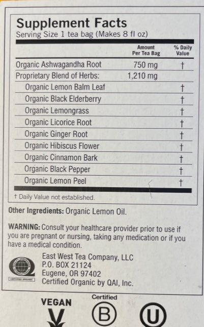 Disfrute de este té de hierbas orgánico con saúco negro, hoja de bálsamo de limón y raíz de Ashwagandha que no contiene OGM ni cafeína. Viene con 16 bolsitas de té. Los ingredientes adicionales para estimular el sistema inmunológico incluyen: