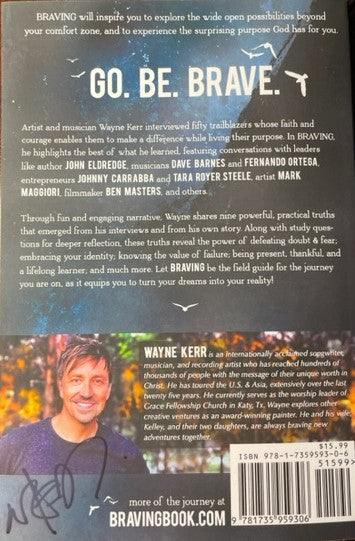 Artist and musician Wayne Kerr interviewed fifty trailblazers whose faith and courage enables them to make a difference while living their purpose. In Braving he highlights the best of what he learned, featuring conversations with leaders life author John Eldridge, musician Dave Barnes and Fernando Ortega, entrepreneurs Johnny Carrabba and Tara Royer Steele, artist Mark Maggiori, filmmaker Ben Masters, and others.