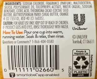 Sweet almond & vanilla bean. Soothing aromatic salts that rejuvenate the body and mind. Relaxing bath or foot soak for sore, tired muscles. The natural way to heal with shea butter, cocoa butter and vitamin E. Find your happy place. Net wt. 20 oz.