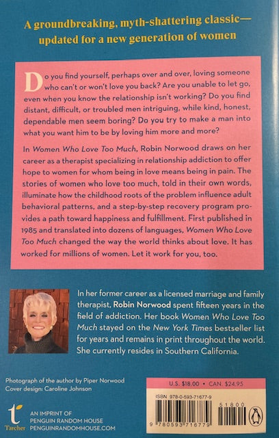 Women Who Love Too Much distills Robin Norwood’s entire career as a therapist specializing in the treatment of co-alcoholism and relationship addiction. Through their own words and stories, women who love too much reveal the roots of their attraction to difficult, troubled, distant men, and Norwood offers them—and you—a way out of the pain using a ten-point guide to recovery, happiness, and fulfillment. First published in 1985 and translated into dozens of languages, Women Who Love Too Much has changed the lives of millions of women around the world. Let it change yours too.